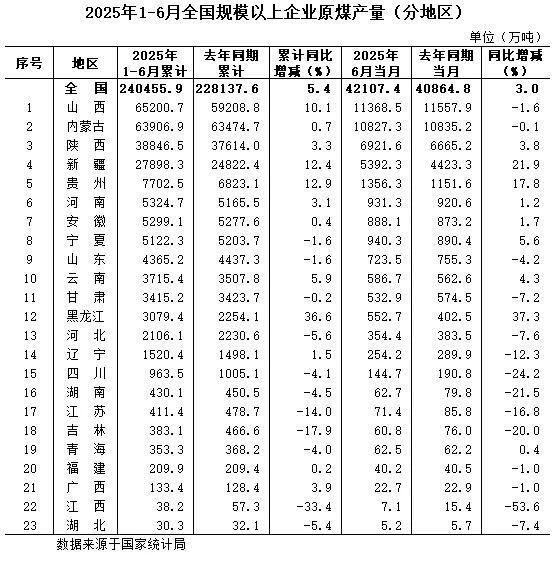1月—6月全国规模以上分省区原煤产量数据发布